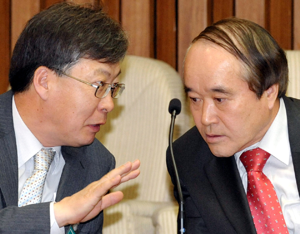 ▲ 13일 오전 국회 제3회의장에서 열린 미디어발전 국민위원회 상견례를 겸한 첫 회의에서 김우룡, 강상현(왼쪽) 공동위원장이 회의 관련 논의를 하고 있다. (뉴시스) |