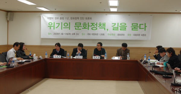 ▲ 19일 서울 여의도 국회 의원회관에서 열린 '이명박 정부 출범 1년, 문화정책 진단 토론회'에서 참석자들이 토론을 벌이고 있다. |