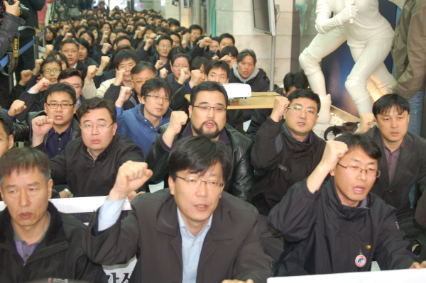 | ▲ YTN 노조가 23일 오전 10시 조합원 2백여명과 언론노조 지본부장들이 참석한 가운데, 파업출정식을 개최하고 있다. | ||