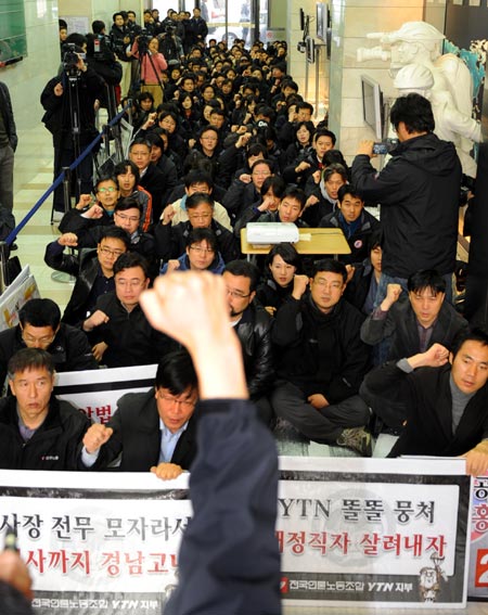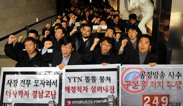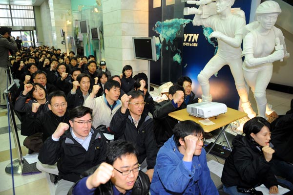 경찰이 YTN 노조위원장 등 4명을 자택에서 긴급체포한 가운데 23일 오전 서울 남대문로 YTN 본사에서 노조원들이 총파업 출정식을 겸한 결의대회를 갖고 있다 (사진=뉴시스)