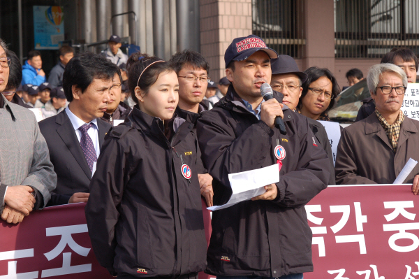 미디어행동은 23일 오후3시30분 서울 남대문경찰서 앞에서 체포된 기자 4명의 석방을 촉구하는 기자회견을 개최했다. 사진은 YTN 조합원 김미선(좌), 성문규(우) 앵커가 기자회견문을 낭독하는 모습.