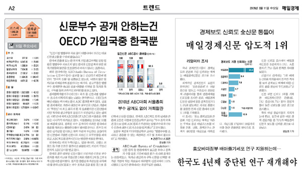 매경은 지난 11일자 2면 ‘신문부수 공개 안하는 건 OECD 가입국 중 한국뿐’이라는 기사(사진)에서 “대한민국 대부분의 산업과 기업에서 투명성이 화두가 된 지 오래지만 신문산업에서만 독자와 광고주들의 알권리가 외면당하고 있다”며 “한국의 경우 대부분 신문사들이 이런저런 이유로 부수 공개를 꺼려 지난해 무료신문 3개와 지방지 2개 등 고작 6개 신문사만 참여했다”고 밝혔다.