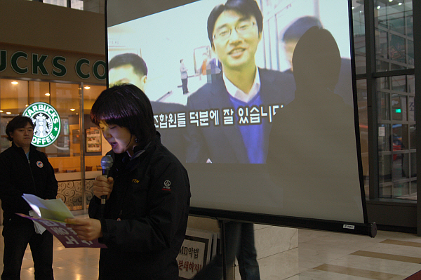▲ 26일 YTN 공채 11기 신윤정 조합원이 노종면 위원장의 옥중 편지를 낭독하고 있다. 뒤로 지난 24일 법원의 영장실질심사를 마치고 남대문경찰서로 돌아온 노 위원장의 동영상이 흐르고 있다. |