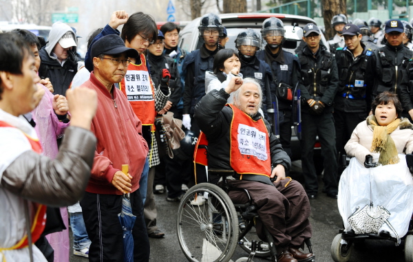 | ▲ 장애인 단체 등 시민단체 회원들이 26일 오후 서울 세종로 정부중앙청사 후문에서 기자회견을 열고 행정안전부의 국가인권위원회 축소 방침 철회를 촉구하고 있다.(뉴시스) | ||