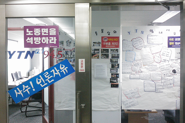 | ▲이제는 역사속으로. 서울 남대문로 YTN 사옥 15층 노조사무실 문에 '공정방송 사수 구본홍 저지 투쟁 2백59일째' '노종면을 석방하라' 플래카드가 붙어있다. 노사 합의에 따라 회사에 '적대적인' 표현이 적힌 게시물들은 일괄 제거된다. | ||
