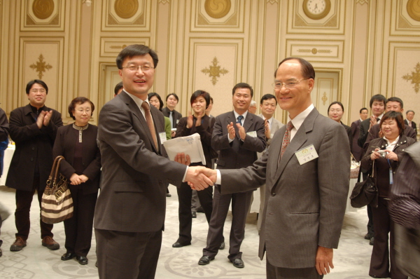 | ▲ 제8회 재외동포기자대회에 참가한 기자 49명이 장학금을 모금, 한국기자협회에 전달했다. 2일 청와대 영빈관에서 정정길 대통령 비서실장 접견 후 열린 장학금 전달식에서 기자협회 김경호 회장(사진 왼쪽)과 재외동포 기자 대표인 남정호 구주신문 전 편집인이 악수를 하고 있다. | ||
