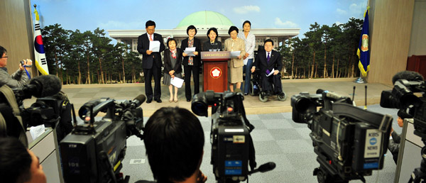 ▲ 지난달 31일 오후 국회 정론관에서 국회 여성위원회 소속 야3당 국회의원들이 청와대 행정관 성뇌물 수수사건과 관련해 대통령 사과 및 재발방지대책 마련과 박재완 국정기획수석 및 정동기 민정수석, 최시중 방송통신위원장 사퇴등을 요구하고 있다.(뉴시스) |