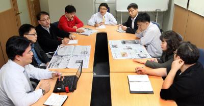 ▲ 머니투데이 평기자들이 지난달 27일 첫 번째 평기자 데스크회의를 갖고 지면 제작을 논의하고 있다. |