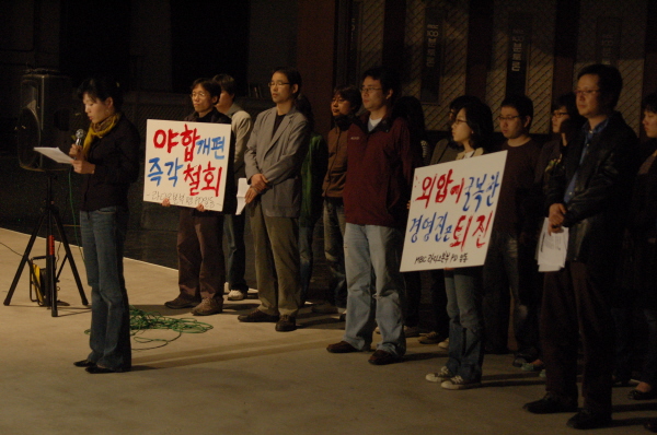 | ▲ MBC 라디오PD들이 김미화씨 교체를 반대하는 기자회견문을 낭독하고 있다. | ||