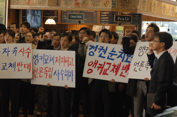 | ▲ MBC 기자들이 10일 오전 MBC 경영센터 로비에서 신경민 앵커 교체를 반대하는 시위를 벌이고 있다. | ||