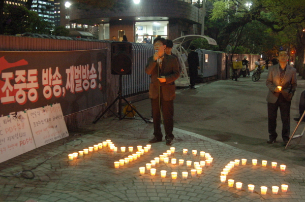 | ▲ MBC 방송센터 앞에서 열린 촛불집회에서 언론노조 최상재 위원장이 발언하고 있다. 시민들이 최 위원장 앞에 촛불로 'MBC'를 새겨놓았다. | ||