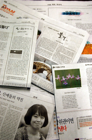 이밖에 경향의 ‘이상범의 디카시’ ‘조은시인의 사진에세이’, 세계의 ‘길 위에서 읽은 시’, 국민의 ‘아침의 시’, 서울의 ‘그림과 시가 있는 아침’, 중앙의 ‘시가 있는 아침’, 한겨레의 ‘시인의 마을’, 한국의 ‘시로 여는 아침’ 등 문학을 조명하려는 작지만 의미 있는 시도들이 이어지고 있다.