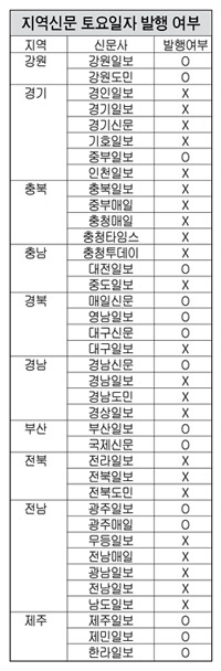 부산·제주 지역도 관심본보가 기자협회 회원사인 지역신문 38개사에 문의한 결과 이 중 60%인 23개사가 토요일에 신문을 내지 않는다고 답했다.