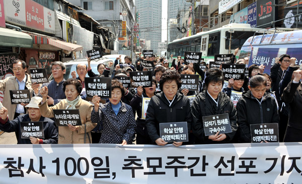 용산참사 1백일을 이틀 앞둔 27일 오전 11시 서울 용산구 한강로2가 남일당 건물 1층. 유가족들과 범국민대책위는 이날도 기자회견을 열고 성명서를 낭독했다. 오후 3시에는 용산참사 해결 촉구를 위한 교수3단체 기자회견이 열렸다.
