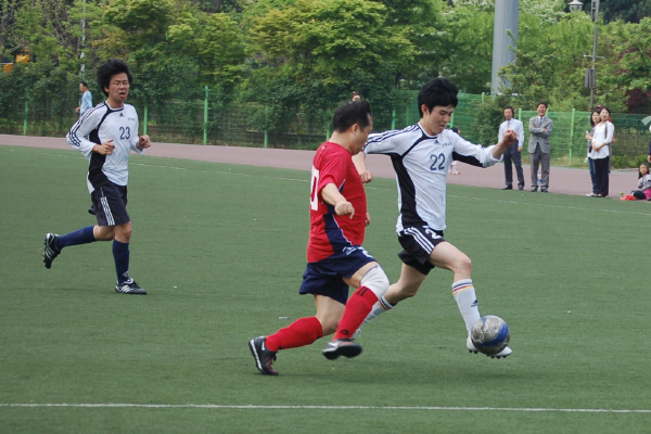 | ▲ 10일 열린 경향신문과 한국일보의 16강전에서 한국일보 선수가 경향신문 진영으로 공을 몰고 들어가고 있다. 경기 결과는 한국의 승리. | ||