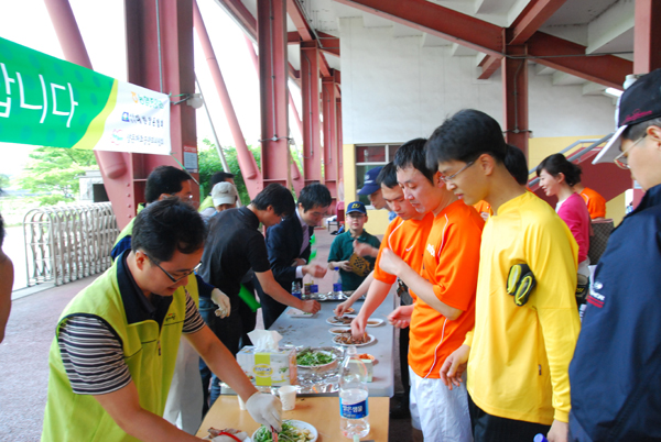 | ▲ 농협중앙회 축산지원팀 양돈팀이 9일 별무리 구장 입구에서 ‘돼지고기 안전합니다’라는 플래카드를 내걸고 시식회를 가졌다. | ||
