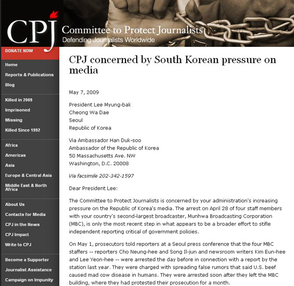 국제언론인보호위원회(이하 CPJ·The Committee to Protect Journalists)는 7일 이명박 대통령 앞으로 서한을 보내고 “언론인보호위원회는 한국정부의 언론탄압을 우려한다”고 밝혔다.