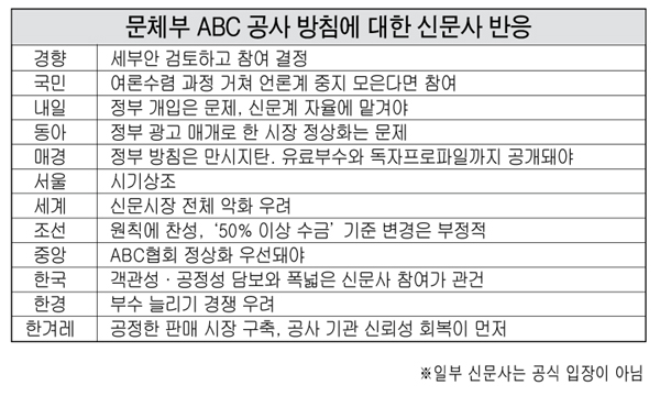 ABC공사의 부수 검증에 참여한 신문·잡지에게만 정부 광고를 주겠다는 정부의 방침에 우려를 표시하는 신문사들이 많다.