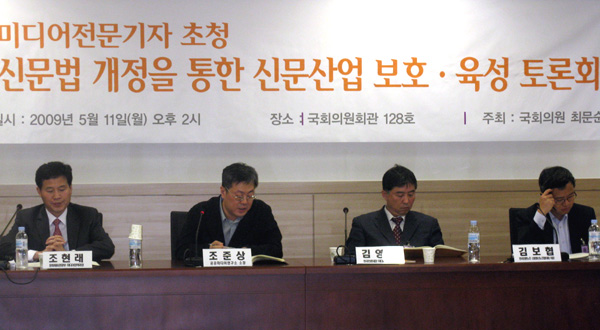 11일 민주당 최문순 의원이 주최한 ‘신문법 개정을 통한 신문산업 보호·육성 토론회’(사진)에서 발제자 및 토론자들은 한목소리로 이같이 주장했다.