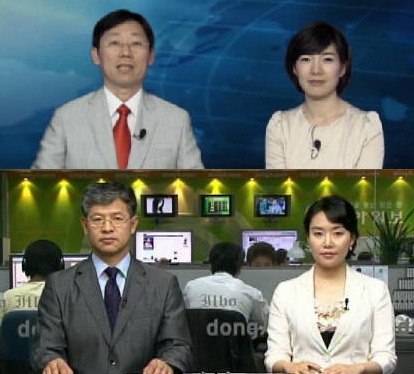 ▲ 신문의 방송 진출이 관심사로 떠오른 가운데 동아일보와 중앙일보가 운영하는 뉴스프로그램이 주목받고 있다. 사진은 ‘TV 중앙일보’의 손장환·주혜경 앵커(사진 위)와 동아 뉴스테이션의 박제균·김현수 앵커. |