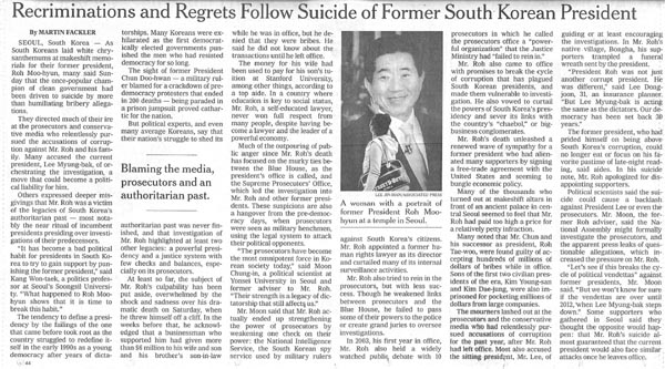 한편 뉴욕타임스는 25일 ‘전직 대통령 자살에 항의하고 애통하는 한국(Recriminations and Regrets Follow Suicide of Former South Korean President)’이라는 기사에서 한국의 분위기를 전하며 ‘정치보복’ 등을 언급했다.