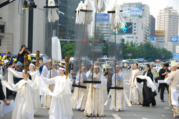 | ▲ 경찰의 봉쇄가 해제된 서울시청앞 광장에서 노무현 전 대통령을 추모하는 노제 예행연습이 벌어지고 있다. | ||