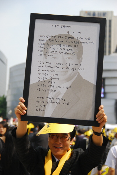 | ▲ 서울광장을 찾은 한 시민이 액자로 만든 유시민 전 보건복지부 장관의 노무현 전 대통령 추모글을 들어올리고 있다. | ||