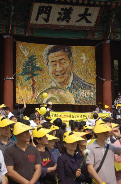 초로의 신사부터 자녀들의 손을 잡고 나온 가족 단위의 시민, 젊은 연인들, 중고교생 등 연령과 성별, 직업을 초월한 시민들 모두 ‘내 마음 속의 대통령’이라는 문구와 노 전 대통령의 사진이 새겨진 노란 모자와 노란 리본을 매고 자리를 잡고 있다. 이미 서울 광장은 물론 도로까지 2만여명의 시민들로 들어찼다.
