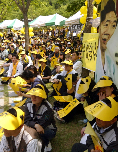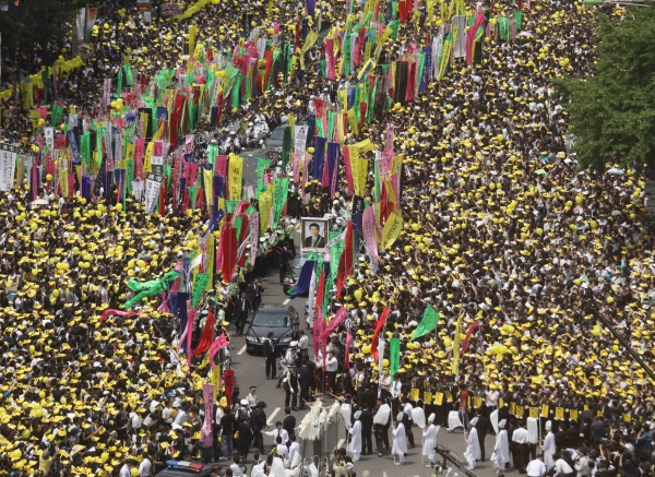| ▲ 29일 오후 故 노무현대통령의 노제가 열리고 있는 시각 경기 수원 연화장에 나온 시민들이 노란 리본을 목에 걸고 노대통령의 노제와 운구행렬을 지켜보고 있다. (뉴시스) | ||