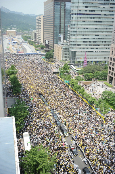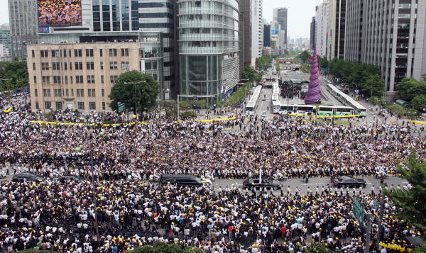 | ▲ 29일 오후 시청앞 광장에서 故 노무현 前 대통령 국민장 노제를 마친 운구행렬이 대형 영정 사진을 앞세우고 수많은 추모인파 사이를 지나 분향소인 서울역으로 이동하고 있다. (뉴시스) | ||