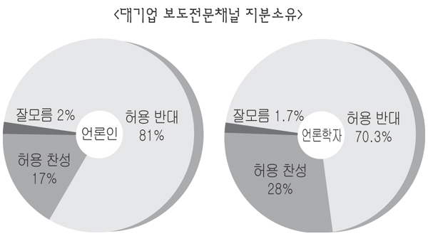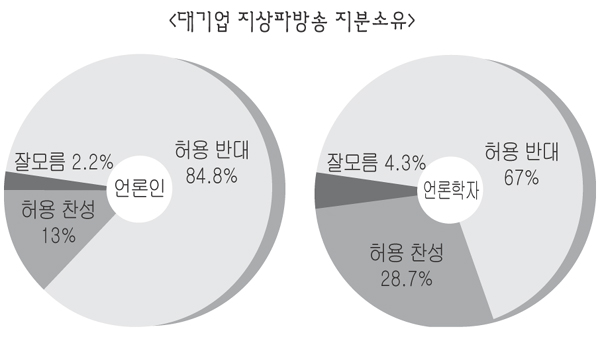 언론인들은 대기업의 경우 지상파(84.8%), 보도전문채널(81.0%), 종편(72.6%) 순서로 반대 의견이 많았다. 언론학자들은 보도전문채널(70.3%), 지상파(67.0%), 종편(61.0%)의 순이었다.
