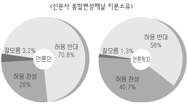 신문사의 종편 소유 반대 응답은 언론인·언론학자 모두 대기업의 경우보다 조금씩 낮았다. 언론인 70.8%가 반대했고 26.0%가 찬성했다. 언론학자는 58.0%가 반대, 40.7%가 찬성이었다.