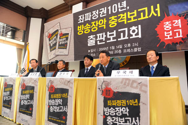 ▲ 지난달 14일 오후 서울 중구 태평로 한국프레스센터에서 열린 방송개혁시민연대의 '좌파정권10년, 방송장악 충격보고서' 출판보고회 및 발족식에서 정수채 MBC공정방송노조위원장이 격려사를 하고 있다. (뉴시스) |