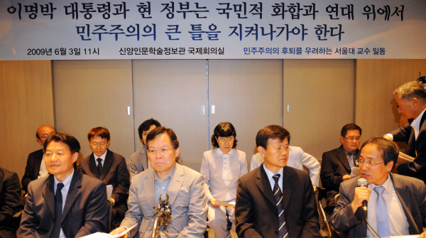 | ▲ 민주주의의 후퇴를 우려하는 서울대학교 교수들이 3일 오전 서울대학교에서 시국선언을 발표하고 있다. | ||