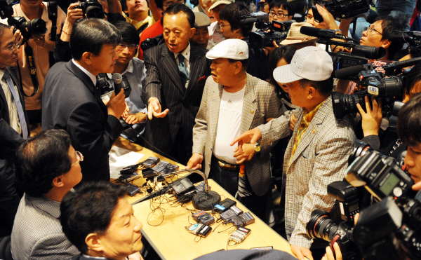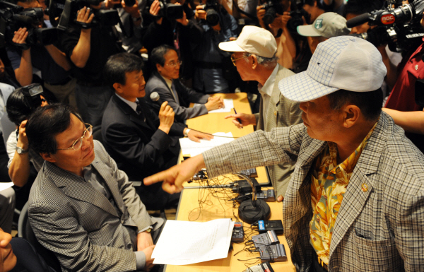 | ▲ 민주주의의 후퇴를 우려하는 서울대학교 교수들이 3일 오전 서울대학교에서 시국선언을 발표한 가운데 회견 중 보수단체 회원들이 거세게 항의하고 있다. | ||