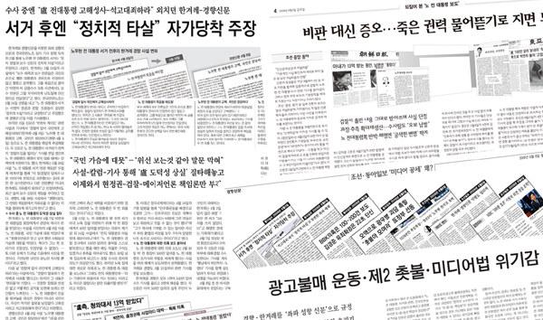 “다른 매체 비판 앞서 자기반성부터” 지적도동아와 한겨레·경향 사이에 고 노무현 전 대통령 관련 보도를 놓고 치열한 지면 전쟁이 벌어지고 있다.