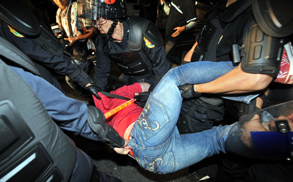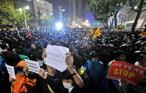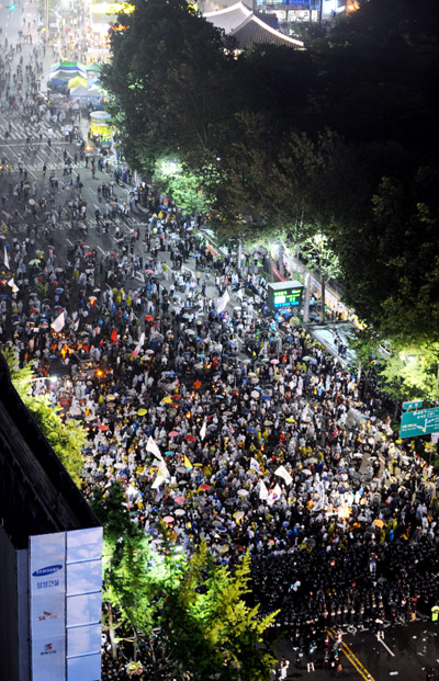 | ▲ 6.10 민주항쟁 22주년 기념일인 10일 밤 서울광장에서 6.10 범국민대회를 마친 시민들이 시가행진을 시도하며 경찰과 대치를 하고 있다.(뉴시스) | ||