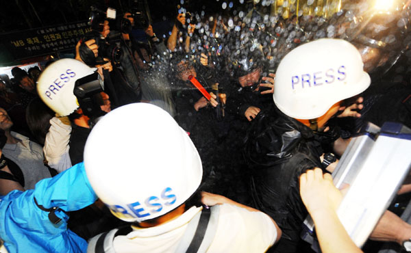 | ▲ 10일 오후 서울광장에서 열린 '6.10 항쟁 범국민대회' 참가자들의 시가행진을 강제진압하던 경찰이 취재중인 사진기자들에게 최루액을 뿌리고 있다. | ||
