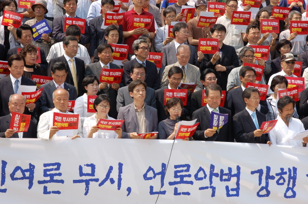 야 4당과 시민단체 주최로 18일 여의도 국회 본청 앞에서 열린 ‘언론악법 저지대회’에서 이강래 민주당 원내대표는 “지난 3월 여야 언론법 합의사항의 전면 무효를 선언한다”고 밝혔다. 여야는 미디어발전국민위원회를 구성해 1백일 동안 미디어관련법을 논의한 뒤 6월 국회에서 표결처리하기로 합의한 바 있다.