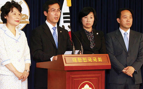 ▲ 한나라당 초선 의원들이 23일 오후 국회 정론관에서 기자회견을 열고 엄기영 사장의 퇴진을 촉구하고 있다.(오마이뉴스 제공) |