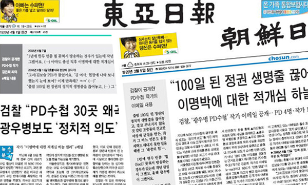 동아일보는 같은 날 1면 머리기사에서 검찰의 주장을 주로 담았다. 그러면서 기사에는 자세히 다루지 않은 이메일 내용 일부를 발췌해 기사와 함께 편집했다. 한겨레·경향신문 등 진보신문들은 이를 두고 “자극적이고 악의적인 내용만 뽑아 보도했으며 작가 개인의 신상 관련 기사도 실었다”며 “간첩수사를 연상케 한다. 사상검열”이라고 맹비난했다. 다만 동아는 PD수첩 제작진의 반론을 싣고 3면 기사의 말미에서 ‘작가 이메일 내용 공개 논란’을 짚었다.