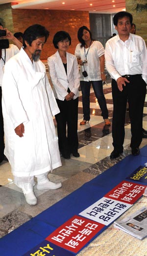 | ▲ 민주노동당 강기갑 대표가 24일 오후 국회 로텐더홀에서 농성중이 민주당 의원들을 격려차 방문하고 있다.(뉴시스) | ||