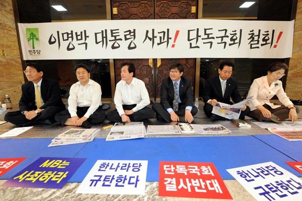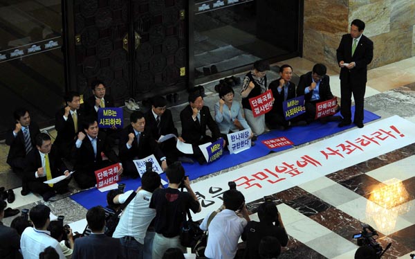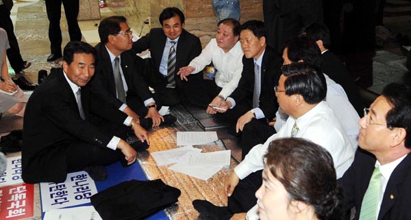 | ▲ 한나라당의 6월 임시국회 소집요구서 제출에 반발하는 민주당 '다시 민주주의'와 '국민모임' 소속의원들이 전날 오후 여의도 국회 본회의장 앞 로텐더홀에서 점거농성에 들어간 가운데 24일 오전 농성을 이어가고 있다.(뉴시스) | ||