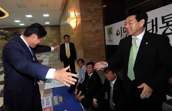 | ▲ 한나라당 장광근 사무총장이 23일 오후 국회 로텐더 홀 앞에서 농성중인 민주당 소속 국민모임-다시민주주의 의원단과 인사를 나누고 있다. (뉴시스) | ||