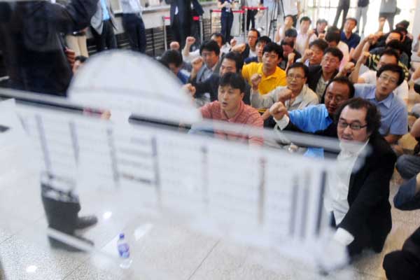 ▲ 국회에서 농성 중인 민주당 의원들을 격려하기 위해 지난달 24일 오후 국회를 찾은 언론노조 지도부와 노조원들이 본청 민원실 앞에서 출입통제에 항의하고 있다.(뉴시스) |