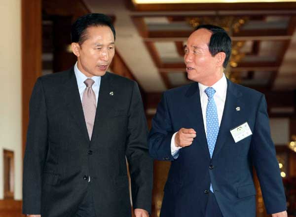 ▲ 이명박 대통령이 지난달 24일 청와대에서 전국 16개 시·도교육감을 초청해 공교육 활성화를 위한 간담회를 하기 위해 안병만 교육과학기술부장관과 함께 회의실로 향하고 있다.(연합뉴스) |