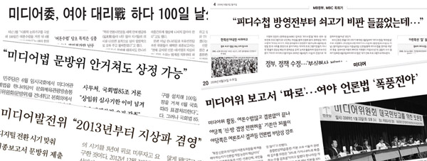 경향신문과 한겨레는 모두 미디어위의 활동 결과에 대해서는 크게 주목하지 않았다. 다만 한겨레는 24일자 20면에서 “미디어위 보고서가 (여야 추천 위원에 따라) 따로 나왔고, 여야 언론법이 폭풍 전야에 놓였다”고 진단했다. 경향신문도 25일 4면 톱기사를 통해 민주당 추천 위원들이 빠진 상태에서 나온 “미디어위 보고서가 내용과 과정도 반쪽이었다”고 지적했다.