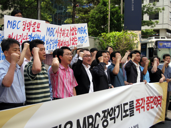 ▲ 청와대와 여권이 방문진 이사들을 친정부 인사로 꾸려 MBC 경영진에 대한 퇴진을 시도할 것이라는 관측이 나오고 있다. 사진은 MBC 노동조합이 지난달 24일 서울 여의도 한나라당사 앞에서 이명박 정부의 MBC 장악 시도를 비판하는 기자회견 장면. |