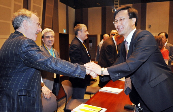| ▲ 김경호 한국기자협회장이 각국 기자들과 인사를 나누고 있다.(뉴시스) | ||
