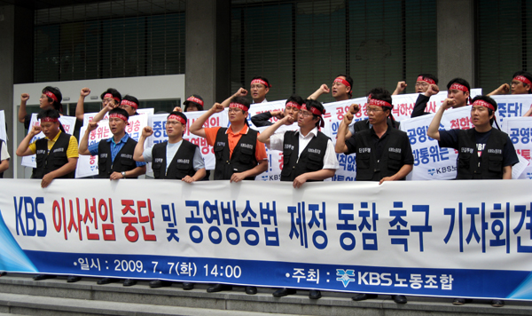 ▲ KBS 노동조합은 7일 서울 세종로 방통위 건물 앞에서 기자회견을 열고 “KBS 이사 공모를 즉각 중단하고 민주성과 투명성부터 담보하라”고 요구했다. |
